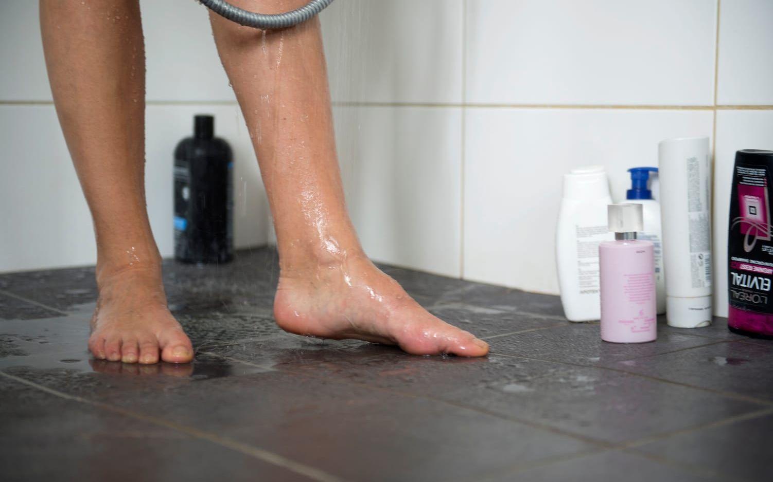 VÄSTERÅS 20130421 En kvinna duschar. På golver står olika flaskor med tvål, schampo och balsam. Foto: Fredrik Sandberg / SCANPIX / Kod 10180 Bild: FREDRIK SANDBERG / TT