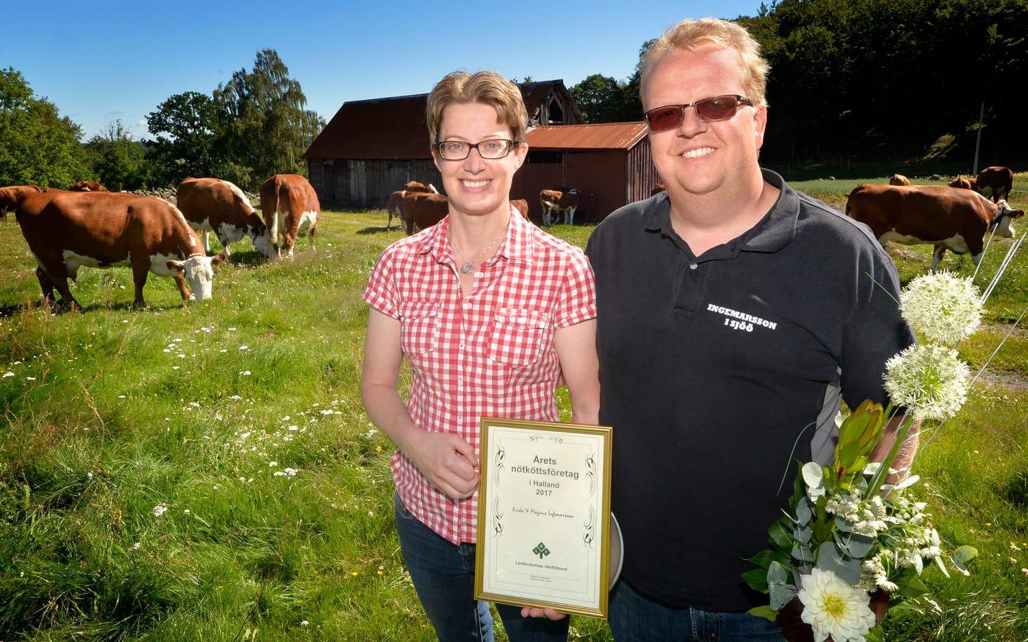 Ingemarsson i Sjöö, Erika, 38, och Magnus Ingemarsson, 43, blev årets nötköttsföretag i Halland. Årets tema är "Ett mindre nötköttsföretag".