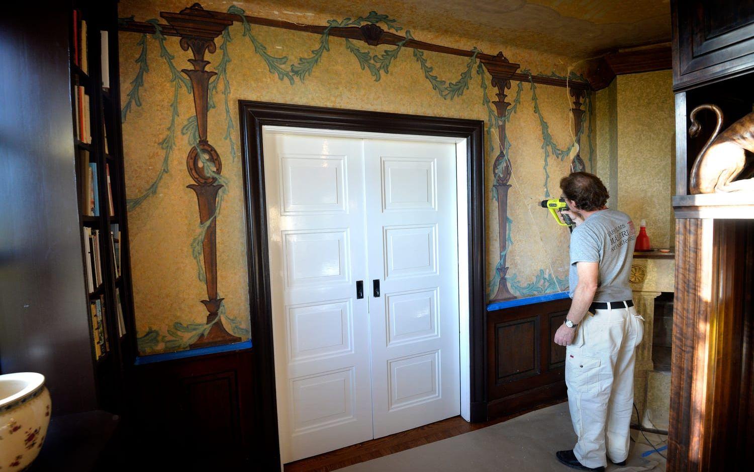 I matsalen pågår renovering av väggmålningarna. Pia Bjering och Lars-Ivar Nilsson lagar sprickor och koncentrerar sig på att få till rätt nyanser som överensstämmer med de ursprungliga målningarna. Det ser ut att vara ett pilljobb.