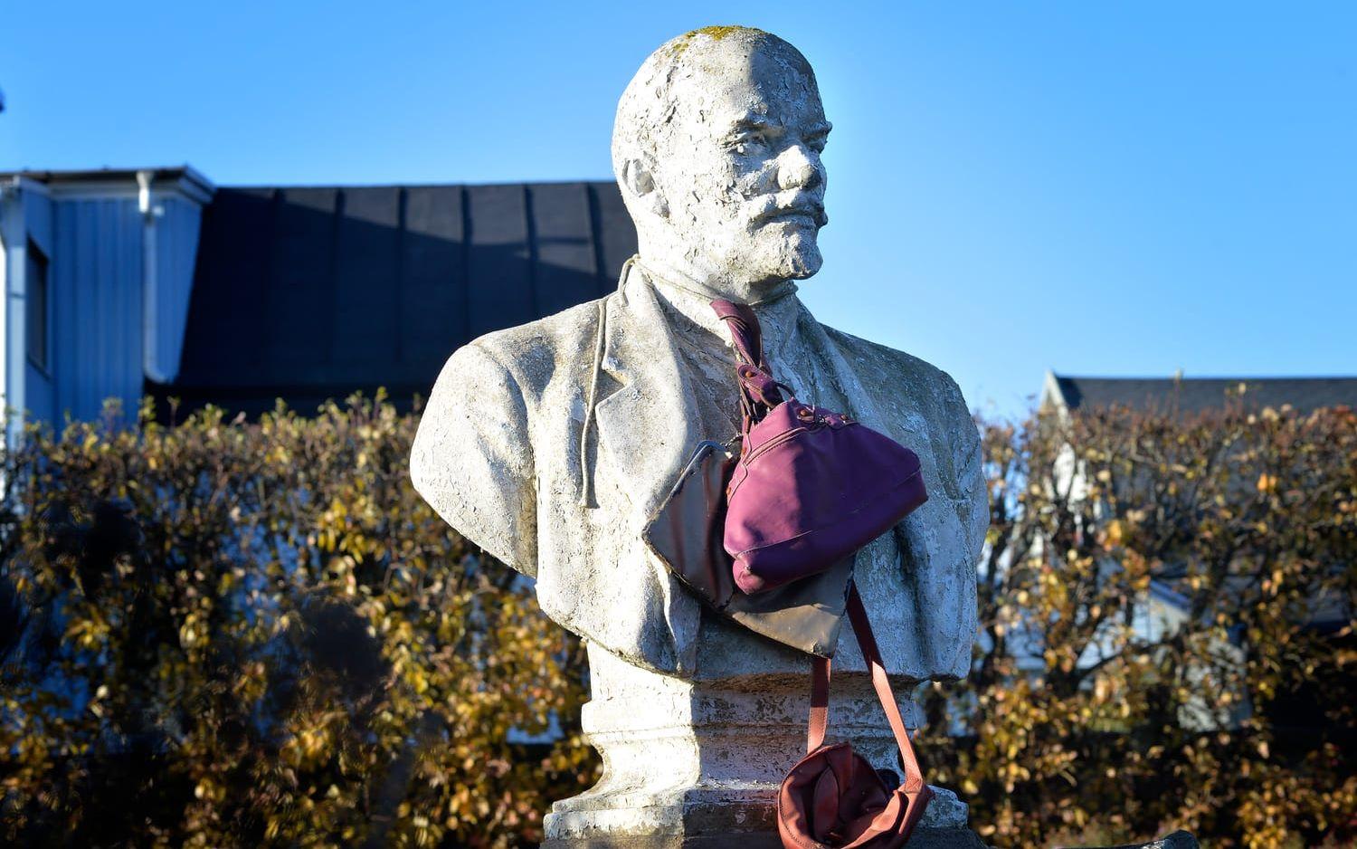 Mitt i trädgården står redan en Leninstaty. Runt dess hals hänger ett antal handväskor, en protest mot den nazistdemonstration som skedde en februarinatt förra året i skydd av mörkret. Det kan också ses som en påminnelse om det infekterade bråket om väskstatyn där Lasse Diding stod på ena sidan och ledande kommunpolitiker på den andra.